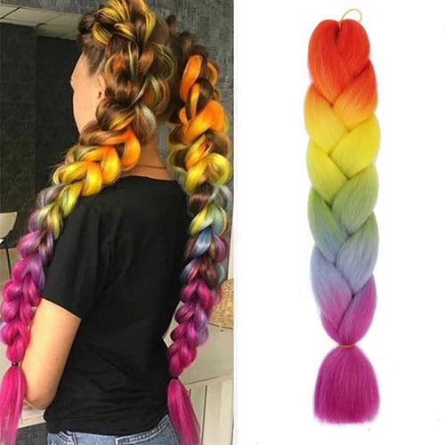 24'' FIVE TONE OMBRÉ JUMBO BRAID HAIR EXTENSIONS RED, YELLOW, GREEN, BLUE, PURPLE SYNTHETIC BRAIDING HAIR